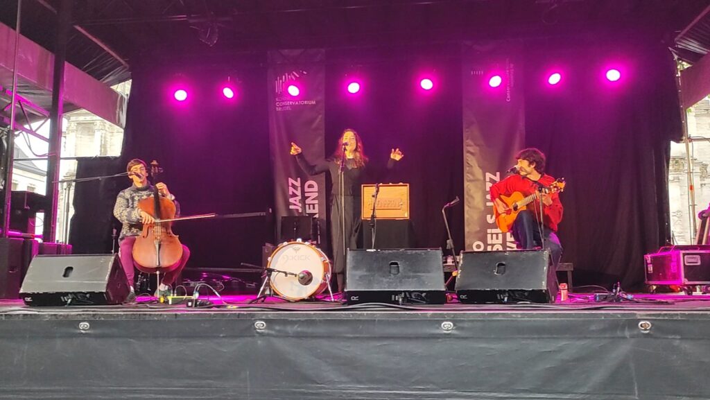 Zaterdag start ik de dag zonder mijn klasgenoten. Ik begin aan het Sint-Katelijneplein waar de groep Peixe e Limao speelt. De zangeres zingt volgens mij in het Portugees. Ze wordt begeleid door een cellist en een gitarist. Samen maken ze melancholische folk muziek die heel ontroerend is. De zwoele klaagzang van de cello en het sierlijke getokkel van de gitaar paart perfect samen met de bekoorlijke stem van de zangeres.