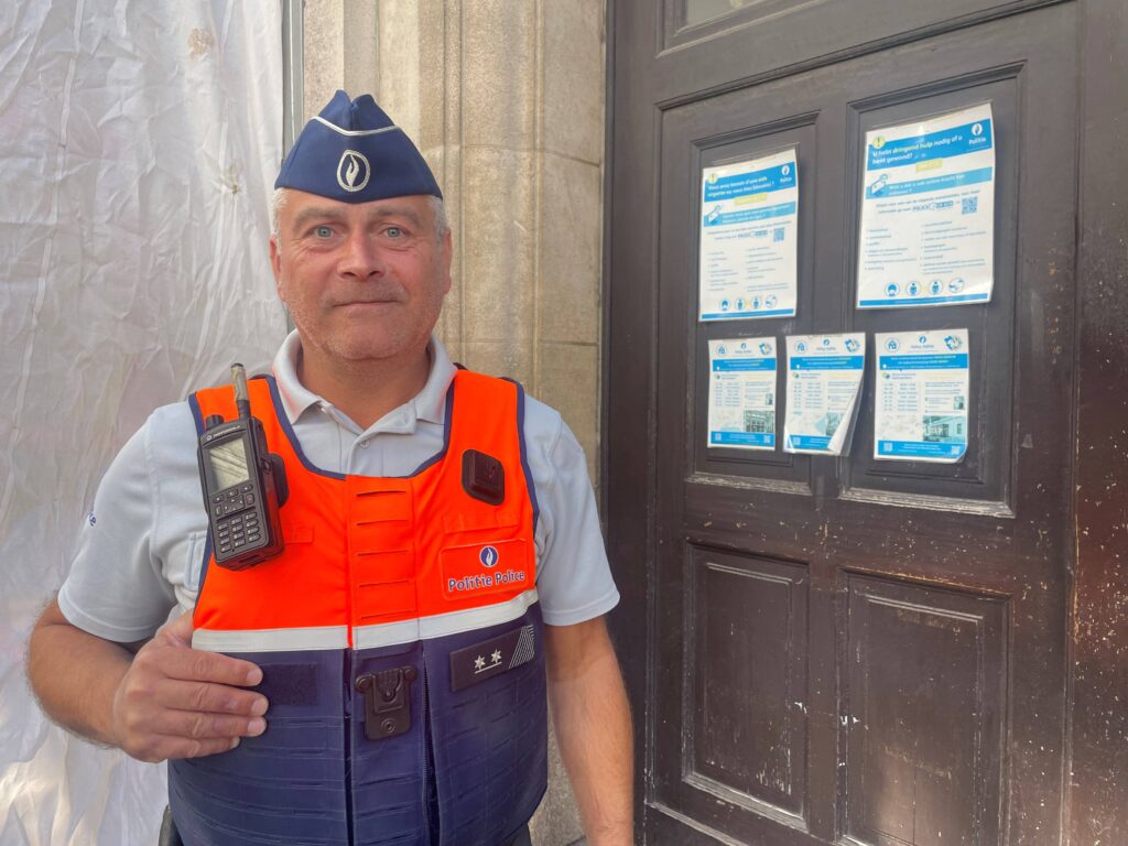 Vandaag ben ik bewaker van het hoofdcommissariaat aan de Grote Markt. Dat houdt in dat ik mensen die aangifte willen doen of die vragen hebben, begeleid naar binnen. Soms moet ik ook mensen kalmeren die in paniek aangifte komen doen of tussenbeide komen als mensen nog in gevecht zijn als ze een klacht willen indienen. Ik heb ook al een paar keer de toegang moeten weigeren omdat mensen te agressief waren.