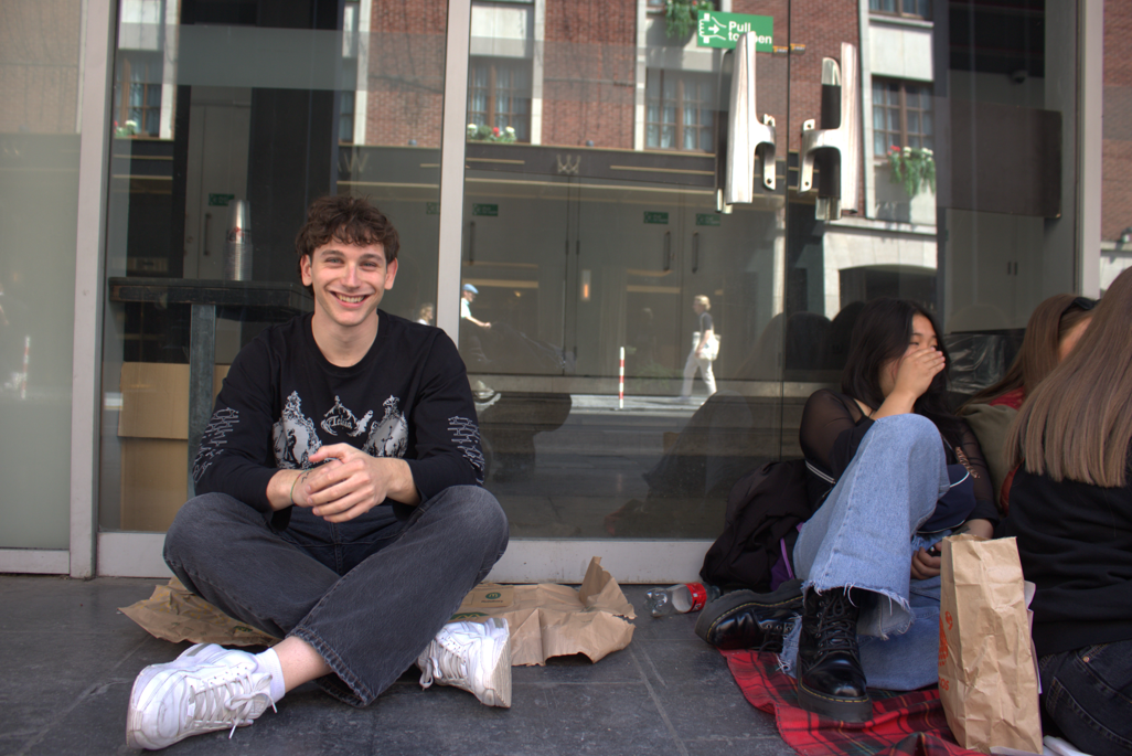 Vandaag wil ik opnieuw helemaal vooraan staan, daarom zit ik hier al sinds elf uur vanochtend op mijn kartonnen bordje. Normaal gezien komt dat wel goed, want we kregen allemaal een nummer op onze hand om de volgorde te bepalen. Ik ben nummer zeven! De anderen in de rij waren toen nog vreemden, ondertussen noem ik hen graag vrienden. We lossen elkaar af om eten te halen of naar het toilet te gaan. Daarnet hebben we zelfs al samen gezongen. Het is allemaal heel gezellig, maar ik kan niet wachten tot we naar binnen mogen.