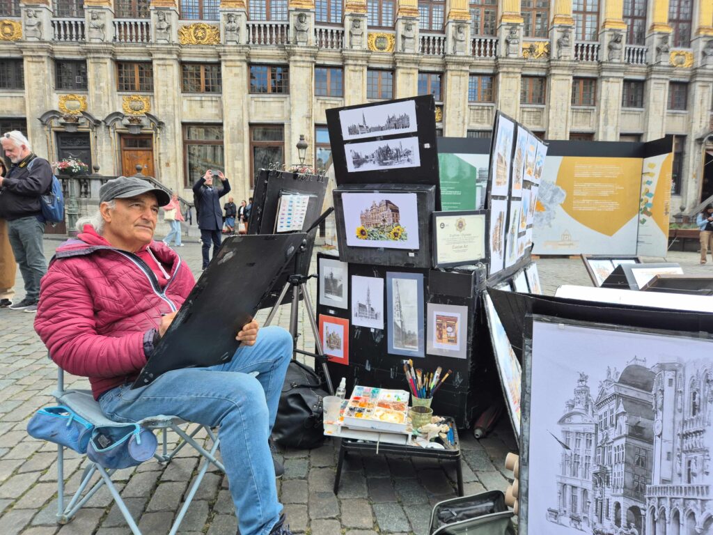 Hallo, mijn naam is Jousef Ziaeian en je kan me altijd vinden op de Grote Markt in het hartje van Brussel. Hier zit ik iedere dag al die mooie gebouwen op deze Grote Markt te tekenen. Ik ben zwaar gefascineerd door al die prachtige monumenten. In die 38 jaar dat ik al in België woon, hebben ze mij nog nooit verveeld.