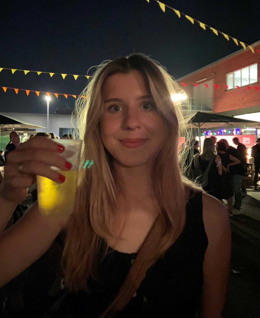 Ik loop verder en ontmoet Anouk De Raeve (20). Ze studeert fotografie in Antwerpen, maar in het weekend keert ze af en toe graag terug naar Hasselt. Voor haar is Vuurdoop de kans om oude vrienden terug te zien, nieuwe mensen te ontmoeten en de lokale muziekwereld te verkennen.